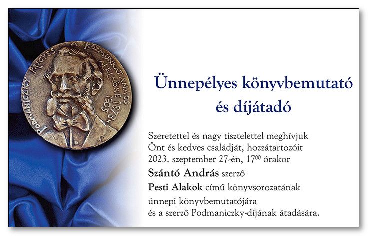 Szeretettel és nagy tisztelettel meghívjuk Ont és kedves családját, hozzátartozóit 2023. szeptember 27-én, 17:00 órakor Szántó András szerző Pesti Alakok című könyvsorozatának ünnepi könyvbemutatójára és a szerző Podmaniczky-díjának átadására.